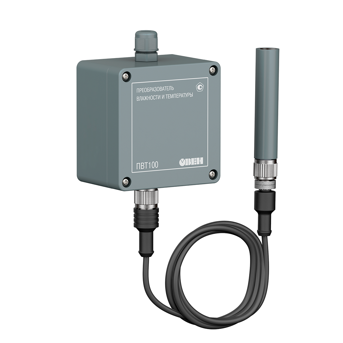 Модели ПВТ100-Н2 и ПВТ100-Н5 имеют соединительный кабель длиной 2,5 или 5 метров. Они применяются в специальных камерах или помещениях, где невозможно разместить базу датчика: в измеряемую среду помещается выносной зонд датчика. Датчик измеряет температуру от -40…+80 ⁰С и относительную влажность от 0...100 %RH. Для задач, в которых помимо аналогового 4…20 мА и цифрового выходного сигнала требуется выходной сигнал напряжение 0…10 В, рекомендуется использовать настенный промышленный датчик влажности и температуры ПВТ110.