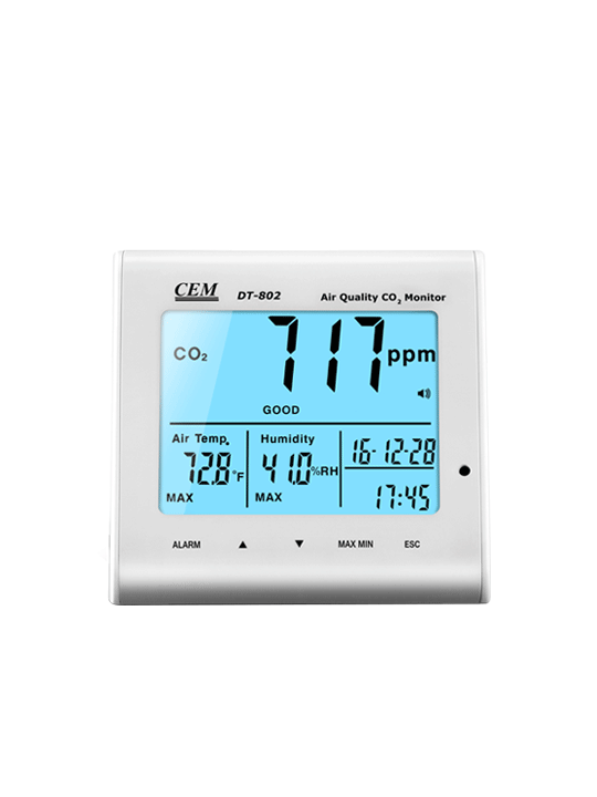 Измеритель DT-802 предназначен для контроля качества воздуха, в том числе отделами охраны здоровья, путем измерения уровня концентрации СО2 в воздухе, например, на предприятиях, в школах, офисах, на транспортных магистралях и т.д. Измеренное значение выражается в ppm (частиц на млн.) и отображается на ЖК-экране прибора с сопровождающим индикатором качества воздуха: Нормальный (0-800 ppm), Удовлетворительный (800-1200 ppm), Загрязненный (свыше 1200 ppm). В случае превышения допустимой нормы содержания СО2 прибор выдает звуковой сигнал.