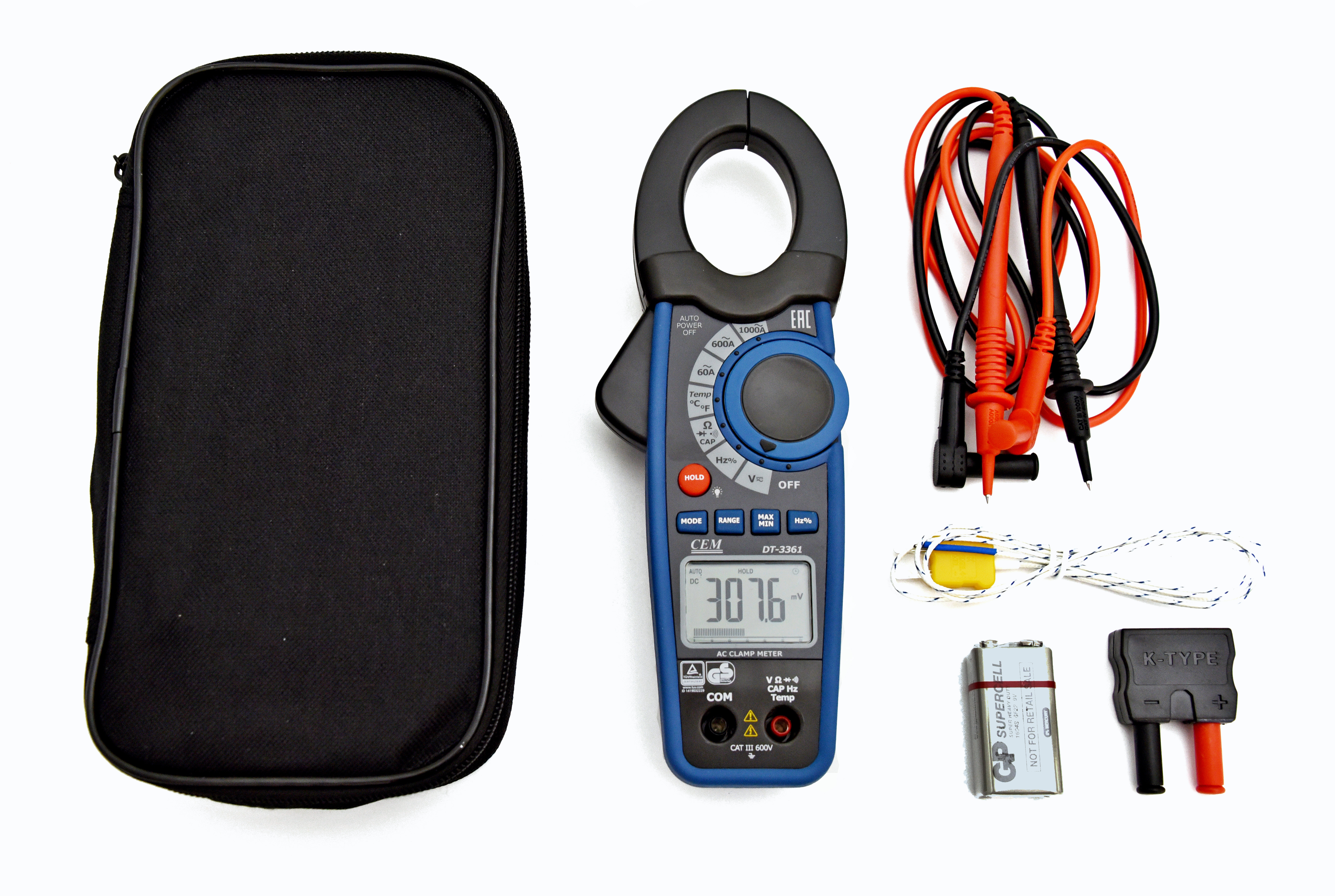 Комплект поставки DT-3361: Прибор, Измерительные провода, Источник питания, Термопара К-типа, чехол, Инструкция по эксплуатации